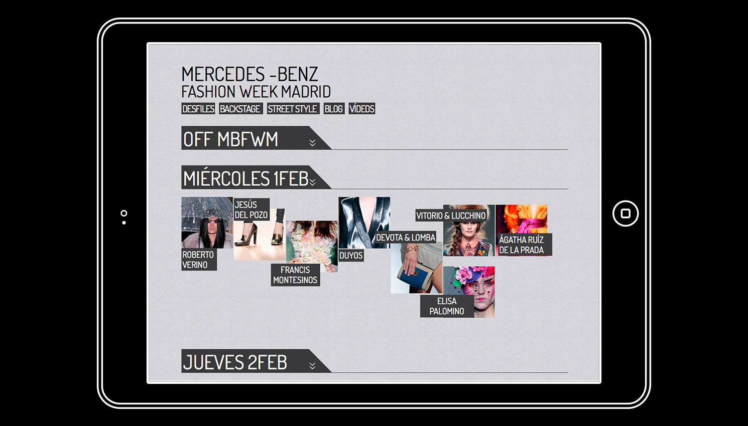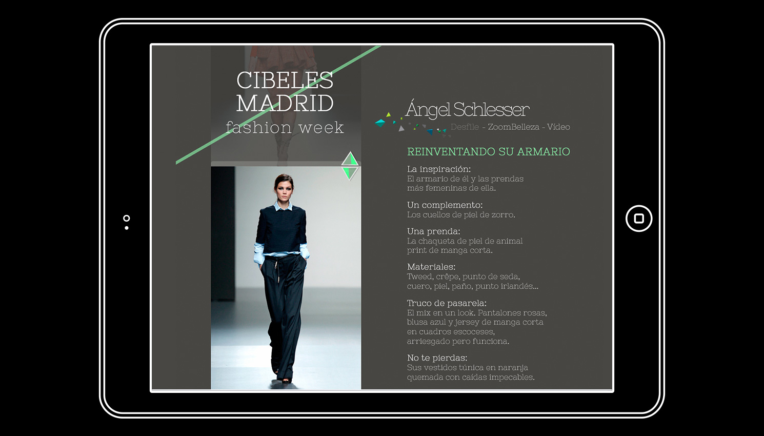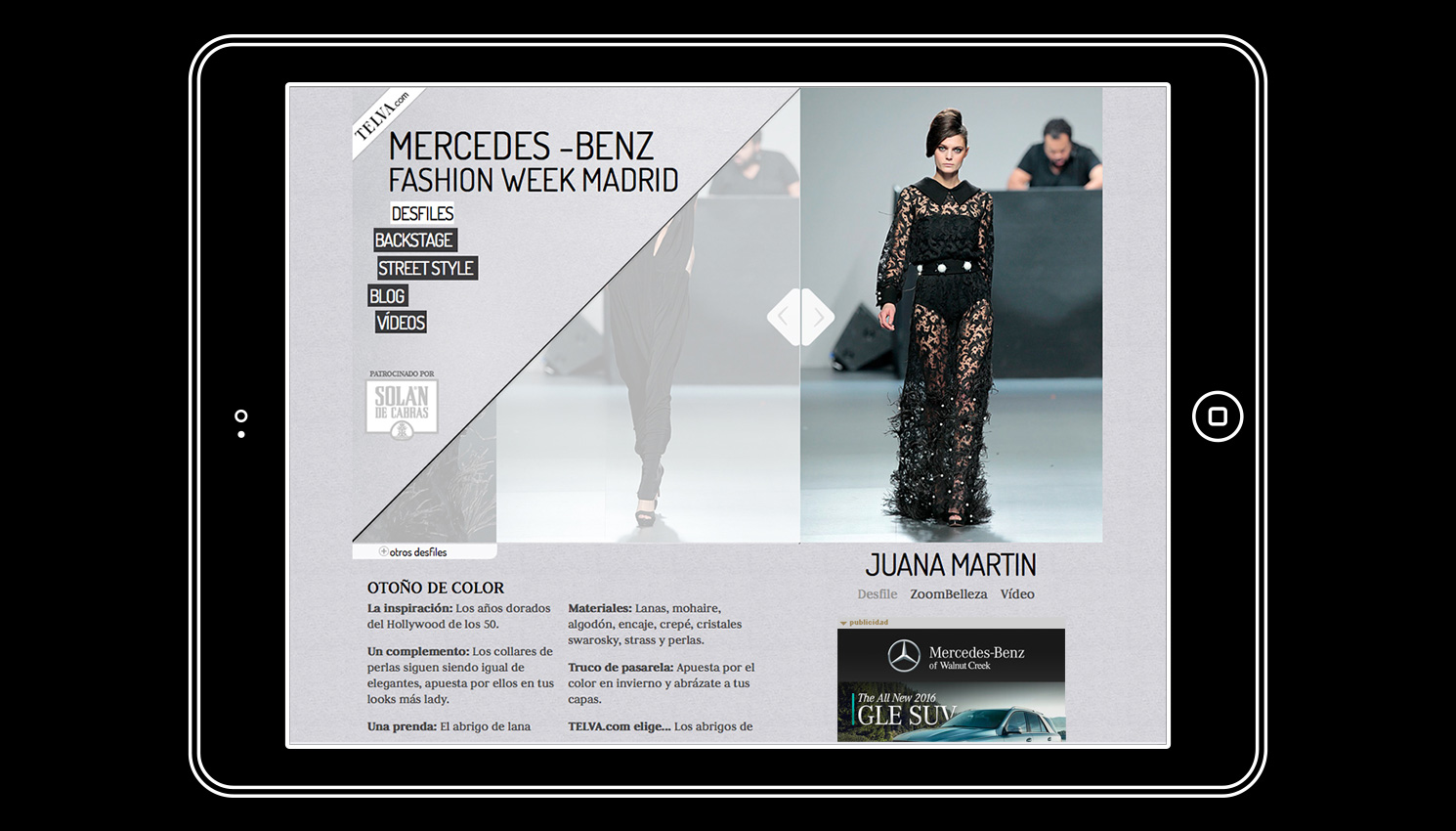I designed microsites for Telva.com to provide up-to-date coverage of Fashion shows, including a review of every runway look, make-up, and hairstyle. A selection of street-style photos from more trendy participants was also featured, as well as exclusive backstage content.